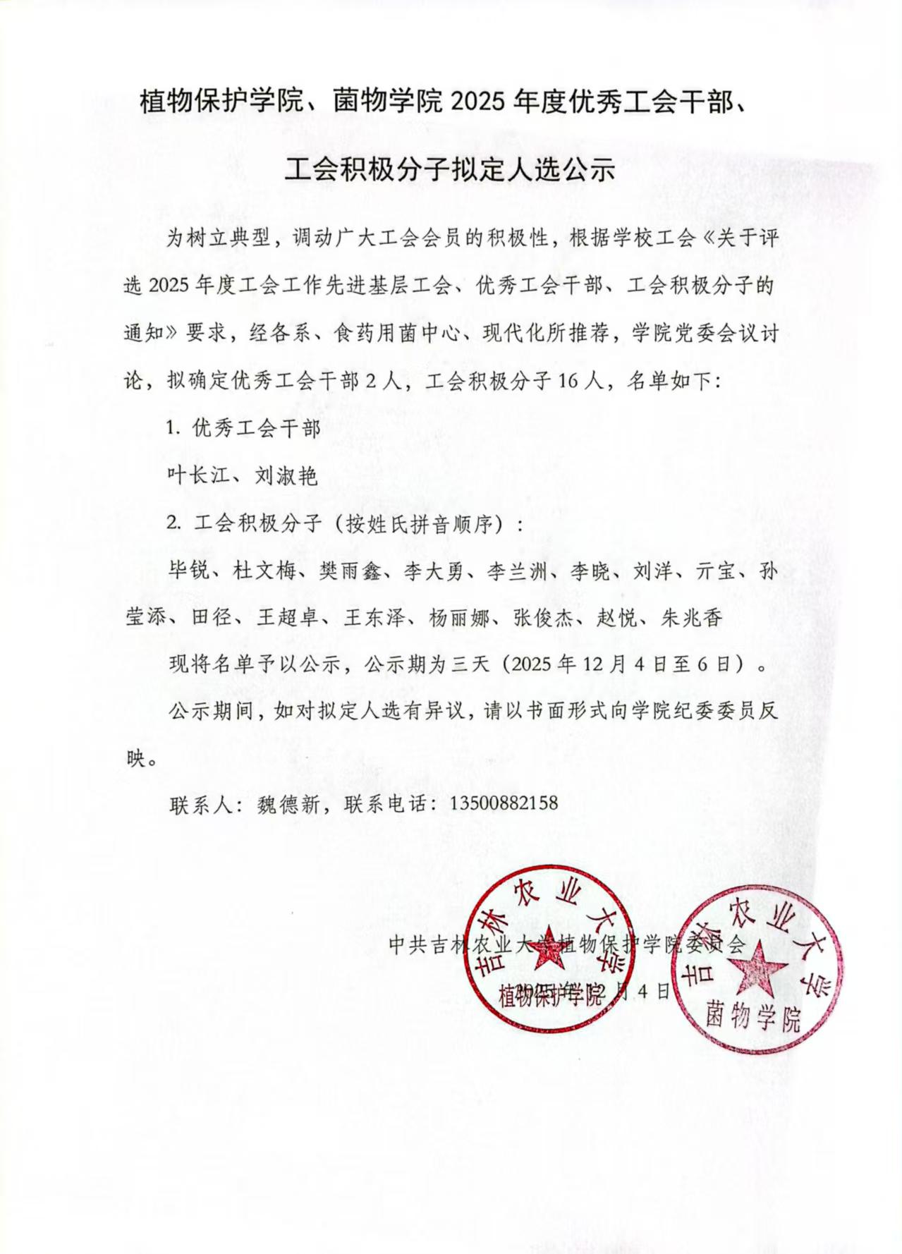 植物保护学院、菌物学院2025年度优秀工会干部、工会积极分子拟定人选公示