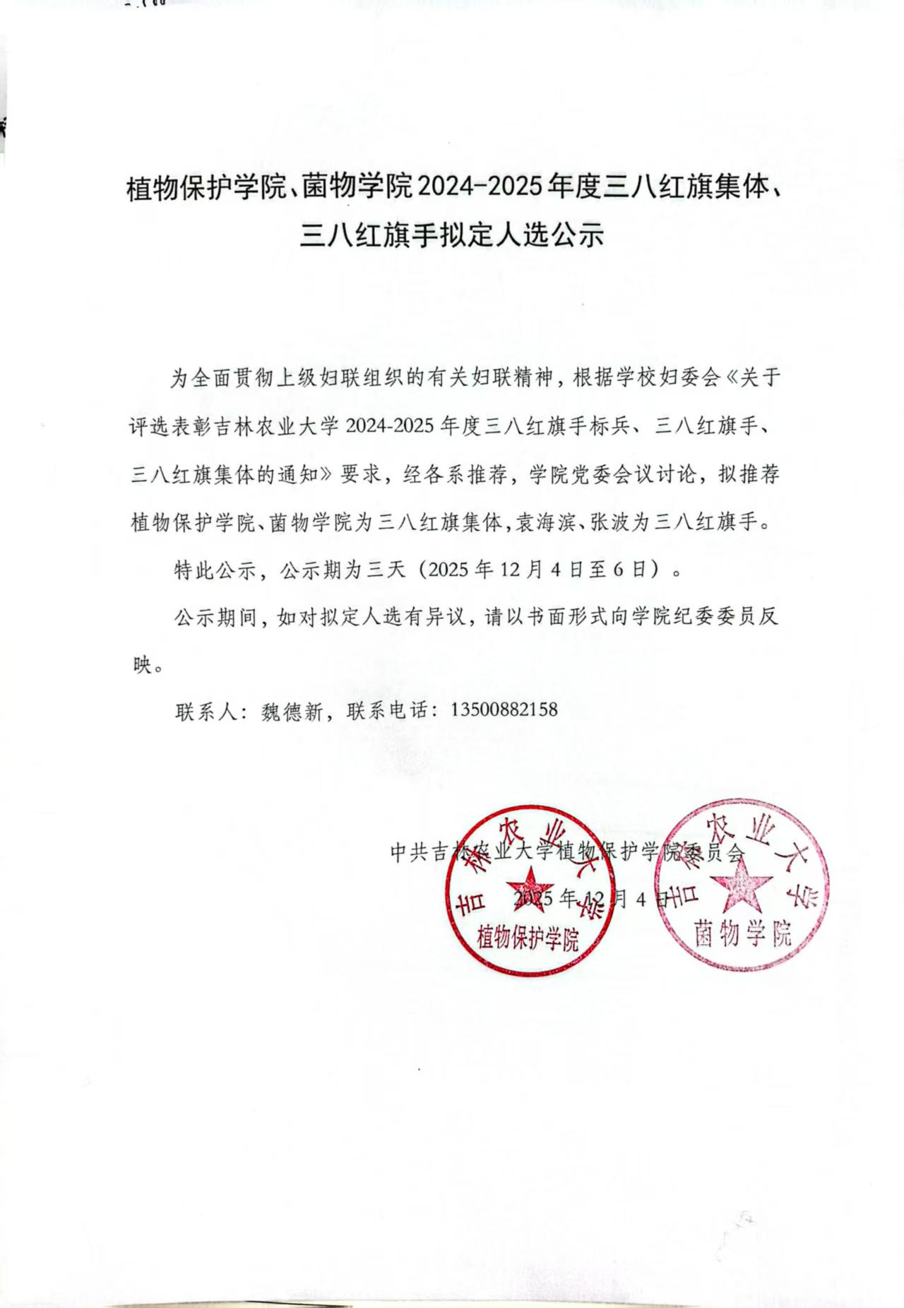 植物保护学院、菌物学院2024-2025年度三八红旗集体、三八红旗手拟定人选公示