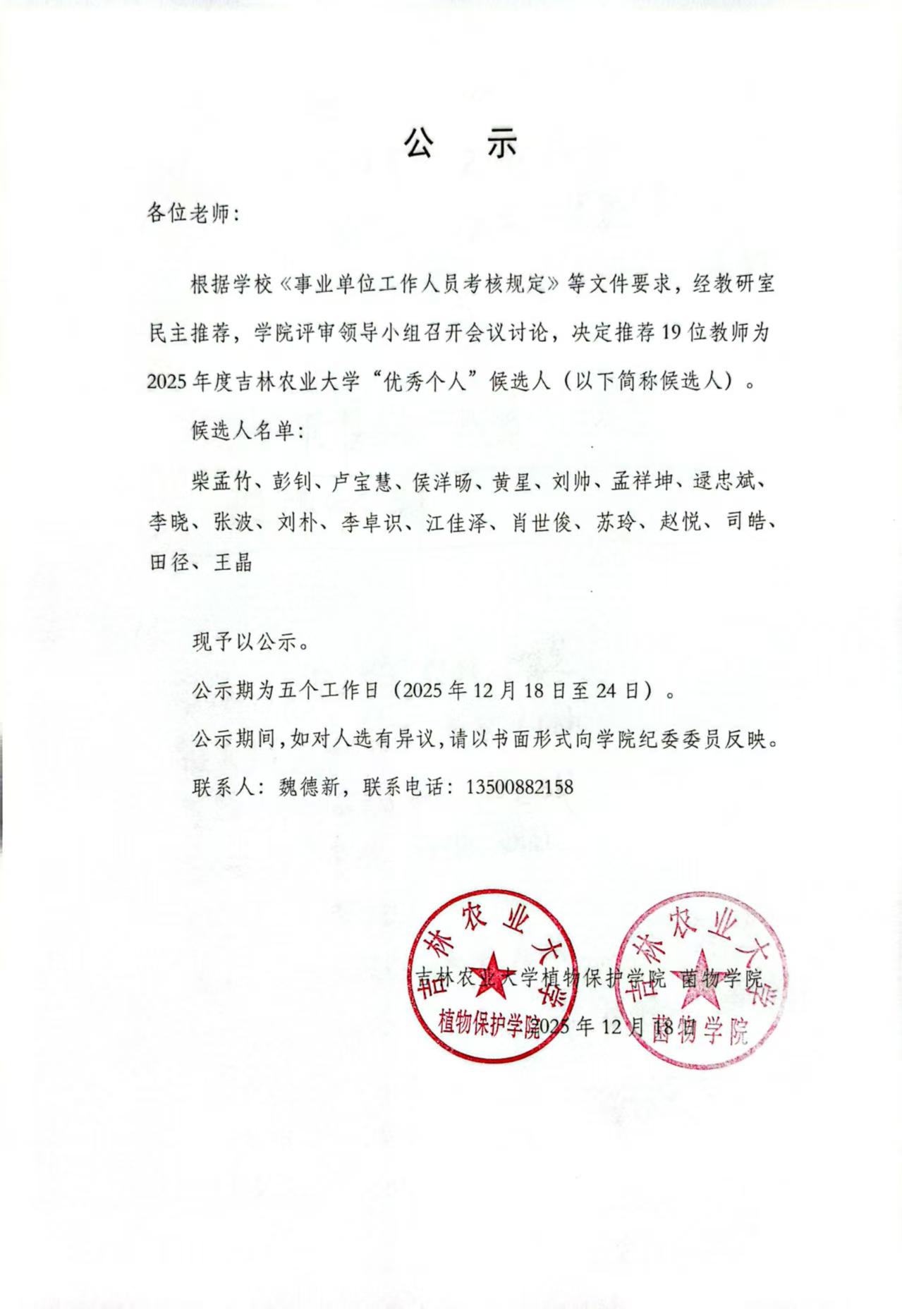 植物保护学院、菌物学院2025年度吉林农业大学“优秀个人”候选人公示