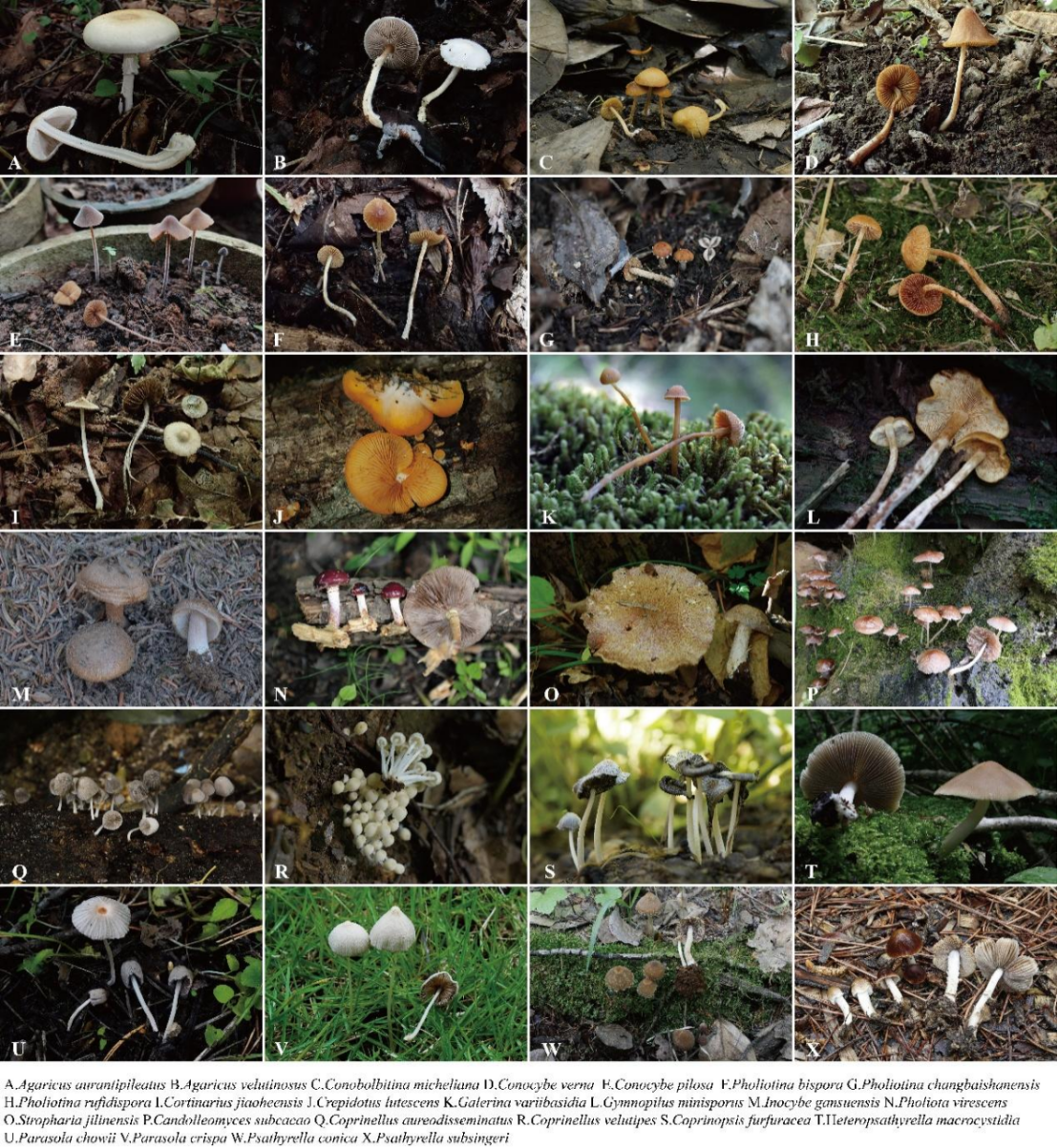 目前已发表暗色孢子伞菌新种96个,为“一区一馆五库”增添新内容,新种数量占该课题组发表大型真菌新种总数的1/2左右,涉及蘑菇目的蘑菇科Agaricaceae(蘑菇属Agaricus)、小脆柄菇科Psathyrellaceae(异脆柄菇属Heteropsathyrella、小脆柄菇属Psathyrella、黄白脆柄菇属Candolleomyces、小鬼伞属Coprinellus、拟鬼伞属Coprinopsis、近地伞属Parasola)、粪伞科Bolbitaceae(锥粪伞属Conobolbitina、锥盖伞属Conocybe、小鳞伞属Pholiotina)、丝膜菌科Cortinariaceae(丝膜菌属Cortinarius)、层腹菌科Hymenogastraceae(盔孢伞属Galerina、裸伞属Gymnopilus)、丝盖伞科Inocebaceae(丝盖伞属Inocybe、靴耳属Crepidotus)、球盖菇科Strophariaceae(鳞伞属Pholiota、球盖菇属Stropharia)以及角孢伞属Asproinocybe,几乎涵盖国际上认可的暗色孢子伞菌所有类群。这些新种正式发表在Mycotaxon、Nova Hedwigia、Phytotaxa、MycoKeys、Journal of Fungi、Mycology、Mycosphere和IMA Fungus等国内外主流刊物上。