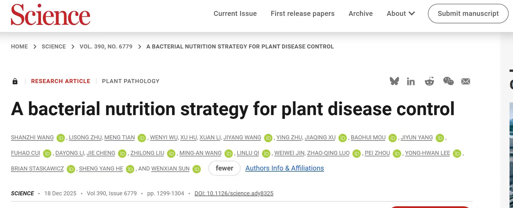 12月19日,我校植物保护学院、菌物学院孙文献教授与国内外多家单位合作,在国际顶尖学术期刊《Science》上发表了题为“A bacterial nutrition strategy for plant disease control”的研究论文。该研究发现细菌性条斑病菌从寄主水稻中获取营养的新机制,开创了阻断细菌营养路径的抗病生物育种策略,为防治多种重要作物细菌性病害提供了新途径,是水稻与病原细菌互作研究领域重要成果。