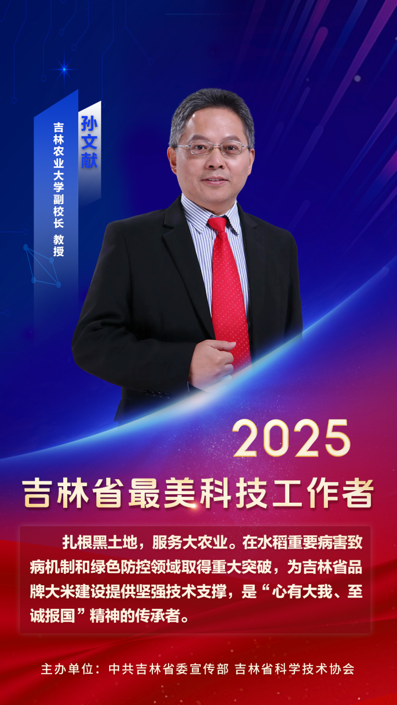 为大力弘扬科学家精神,激发科技工作者的荣誉感、自豪感、责任感,引导和激励广大科技工作者坚持“四个面向”,学习最美、争当最美,为奋力推动吉林高质量发展明显进位、全面振兴取得新突破作出新贡献,中共吉林省委宣传部、省科协联合评选出10名2025年“吉林省最美科技工作者”,学校副校长,植物保护学院、菌物学院孙文献教授获此殊荣。