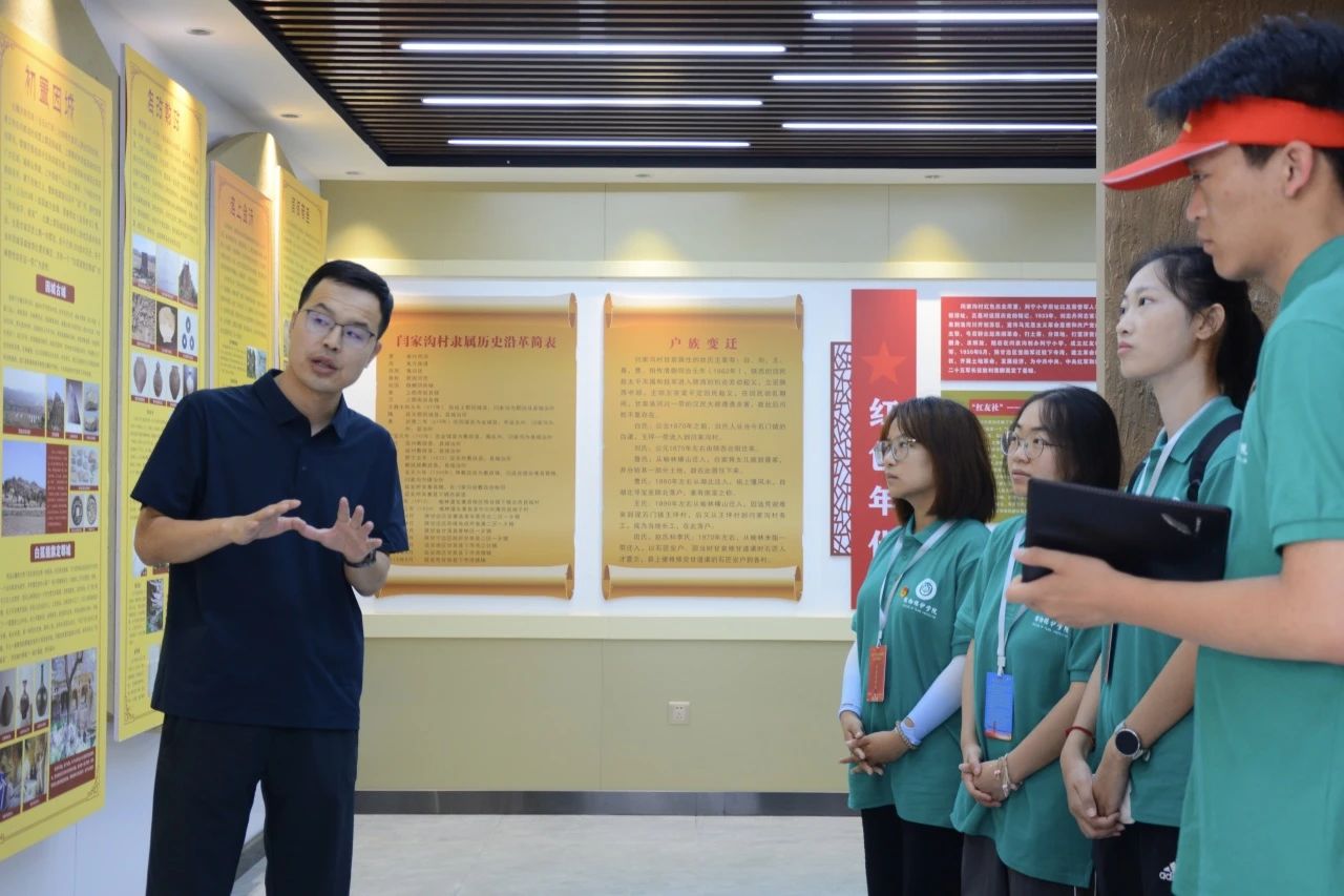 7月15日上午,实践团启程前往甘泉县下寺湾镇闫家沟村开展实践学习。首先,党支部书记张卫东带领团队成员参观了闫家沟村史馆,这里是当地乡村文化传承的重要载体。展馆内展示了村史文化、人员构成、农业发展、民俗风情等内容,通过宣传展板、老照片、旧物件等,团队成员深入了解了村庄从传统农耕社会迈向现代化发展的进程,尤其是村民生活条件的改善和村庄面貌的变迁。