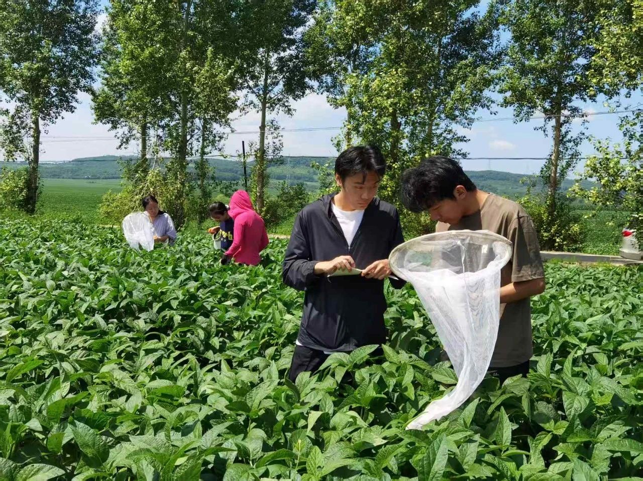 在敦化市沙河沿农场,团队开展田间实践活动,深入黑土地实施大豆病虫害系统调查,了解当地大豆病虫害主要种类,发生为害特点,以及天敌昆虫资源情况,并询问了当地农技推广技术人员对病虫害的预测预报和防控技术问题。团队成员走进敦化江南镇上石桩子村进行大豆病虫害标本的采集,并根据前期调查结果,对大豆蚜、斑鞘豆叶甲和大豆霜霉病等进行生物防控试验。