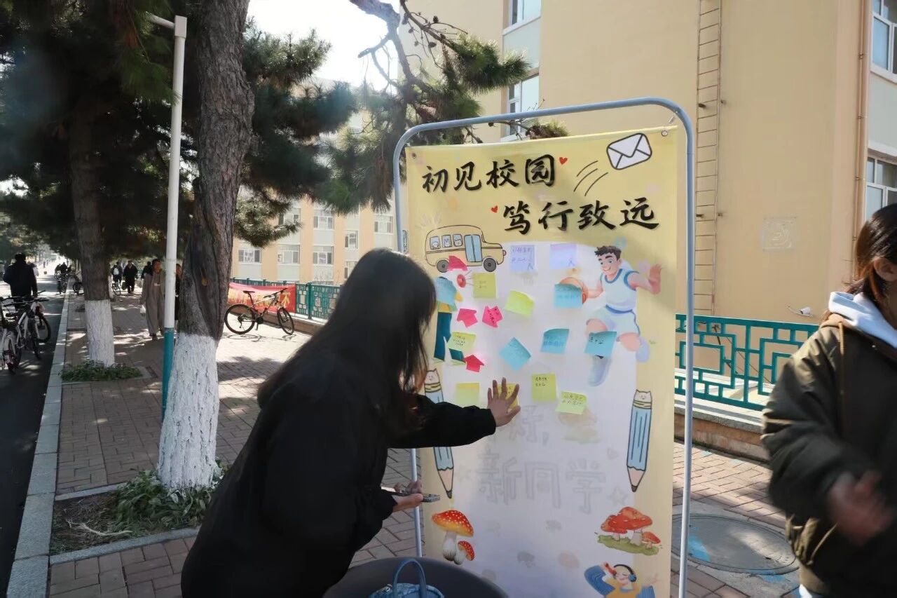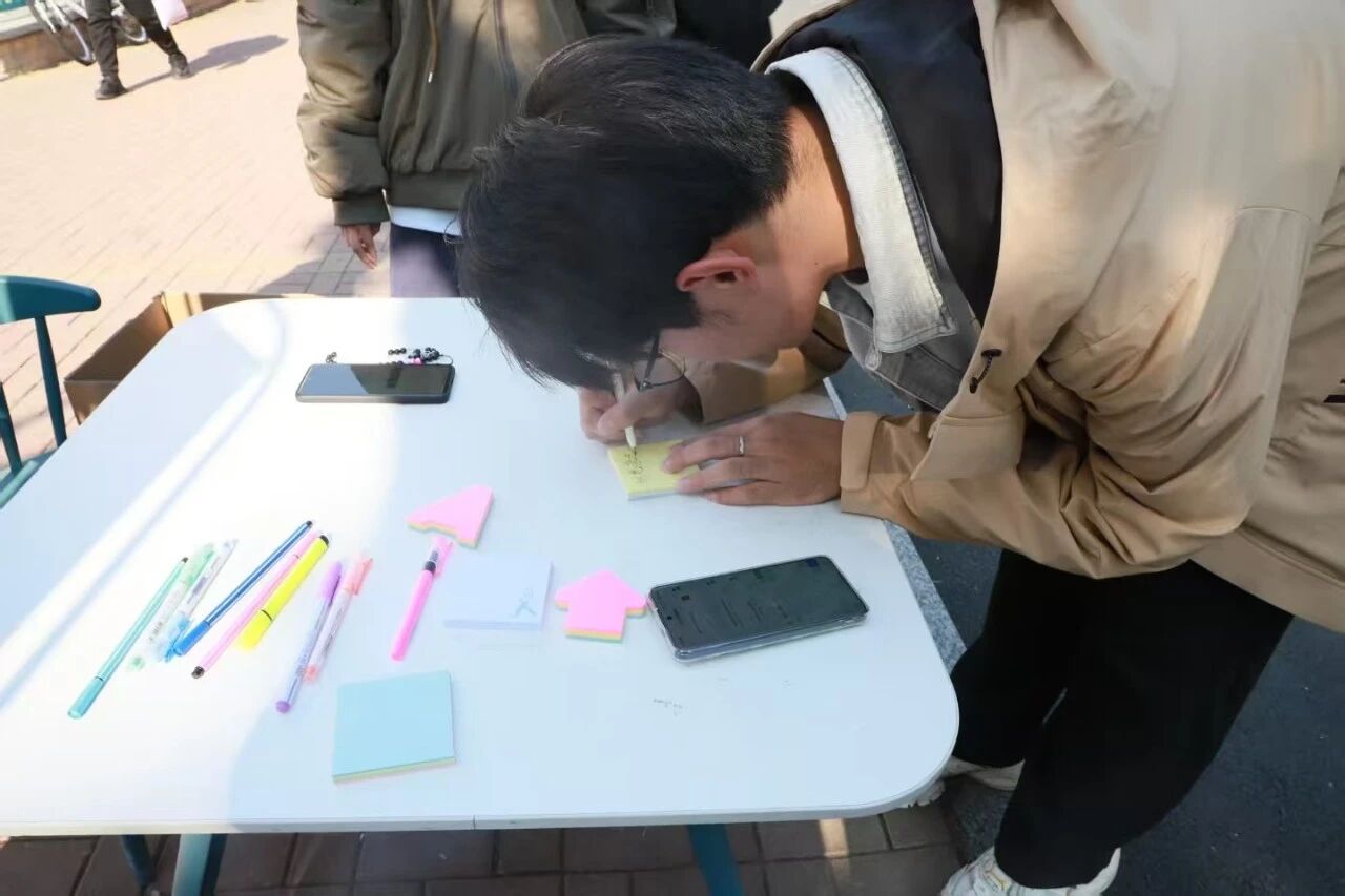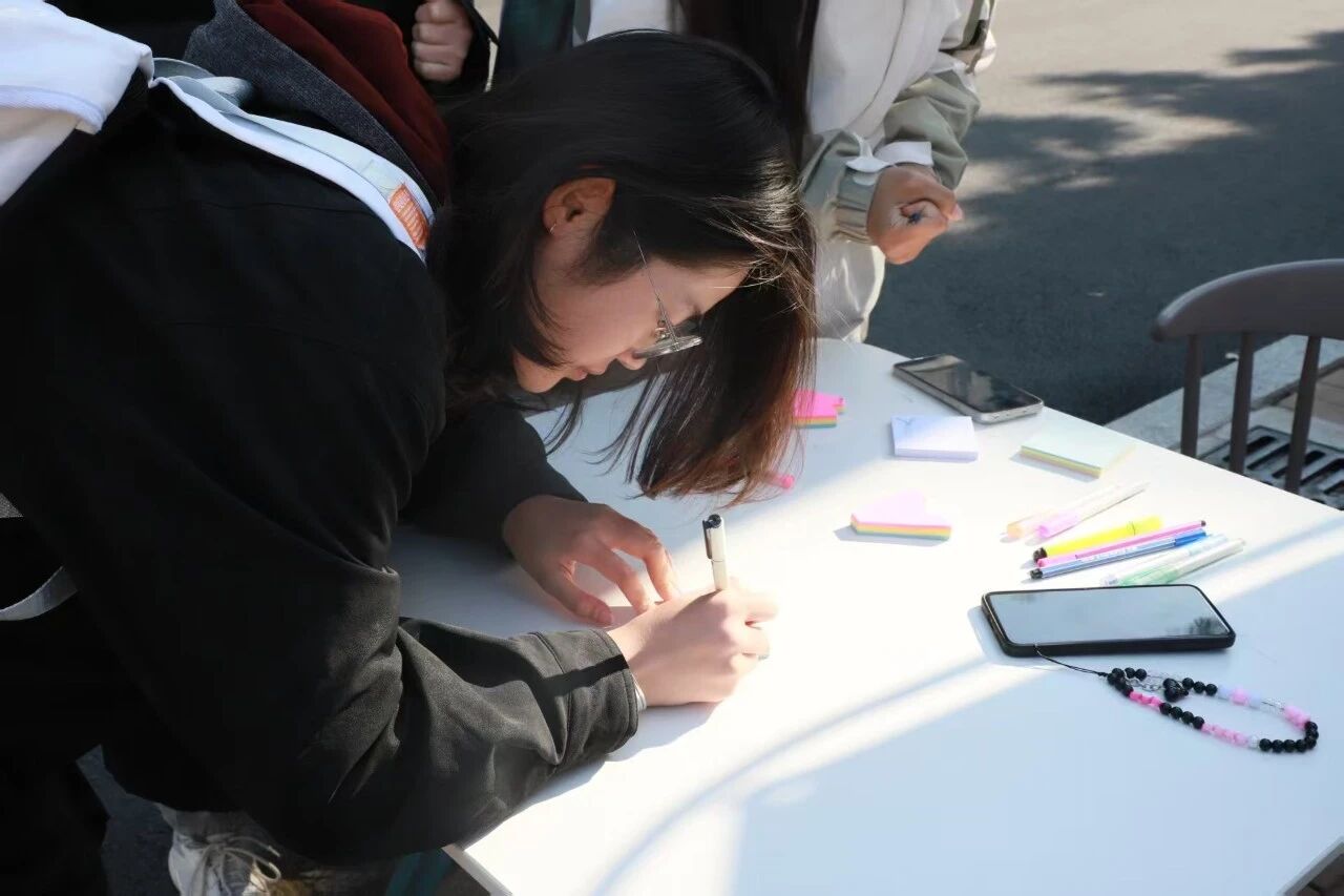 活动现场,主题醒目的易拉宝成为焦点,同学们有序上前,用马克笔在易拉宝上写下开学以来的感悟——既有初入校园的新鲜体验,也有对学业生活的初步思考,真挚文字勾勒出新生们的成长初心。随后,大家将写好的目标信件,认真折叠后投入活动专属信箱,将青春的憧憬与决心封存为独特的“时光胶囊”。